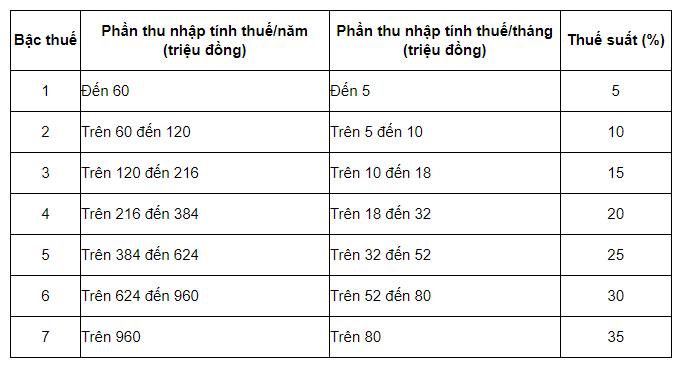 Mức thuế TNCN phải đóng đối với người có thu nhập từ tiền lương, tiền công được tính theo lũy tiến từng phần. Nói cách khác, thu nhập tính thuế càng cao thì số thuế phải nộp càng cao (thuế suất càng cao). Cụ thể gồm 07 bậc thuế: